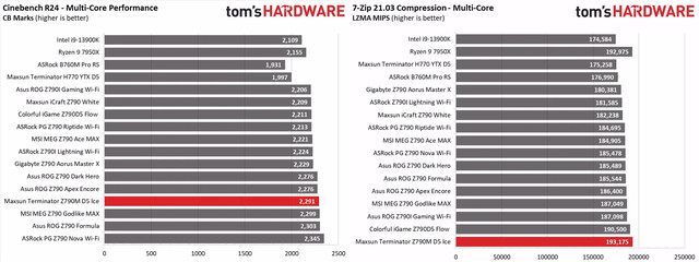 За MSRP $189.99, Terminator Z790M D5 Ice пропонує значну продуктивність. Плата має стандартні ліміти потужності 253 Вт для PL1 і PL2, що дозволяє використовувати всі можливості її продуктивності за умови адекватного охолодження. Хоча VRM можуть нагріватися під час тривалих важких навантажень на процесор через їх скромний дизайн, плата все ж забезпечує надійну продуктивність, особливо в тестах 7Zip і Procyon Office, а також добре працює в ігрових сценаріях.