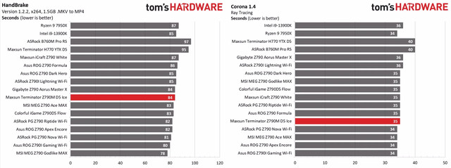 Результати в часованих додатках також показують подібні результати. Тести LAME та Corona були середніми, тоді як результати Handbrake були номінально кращими за середні. Загалом, продуктивність є задовільною!